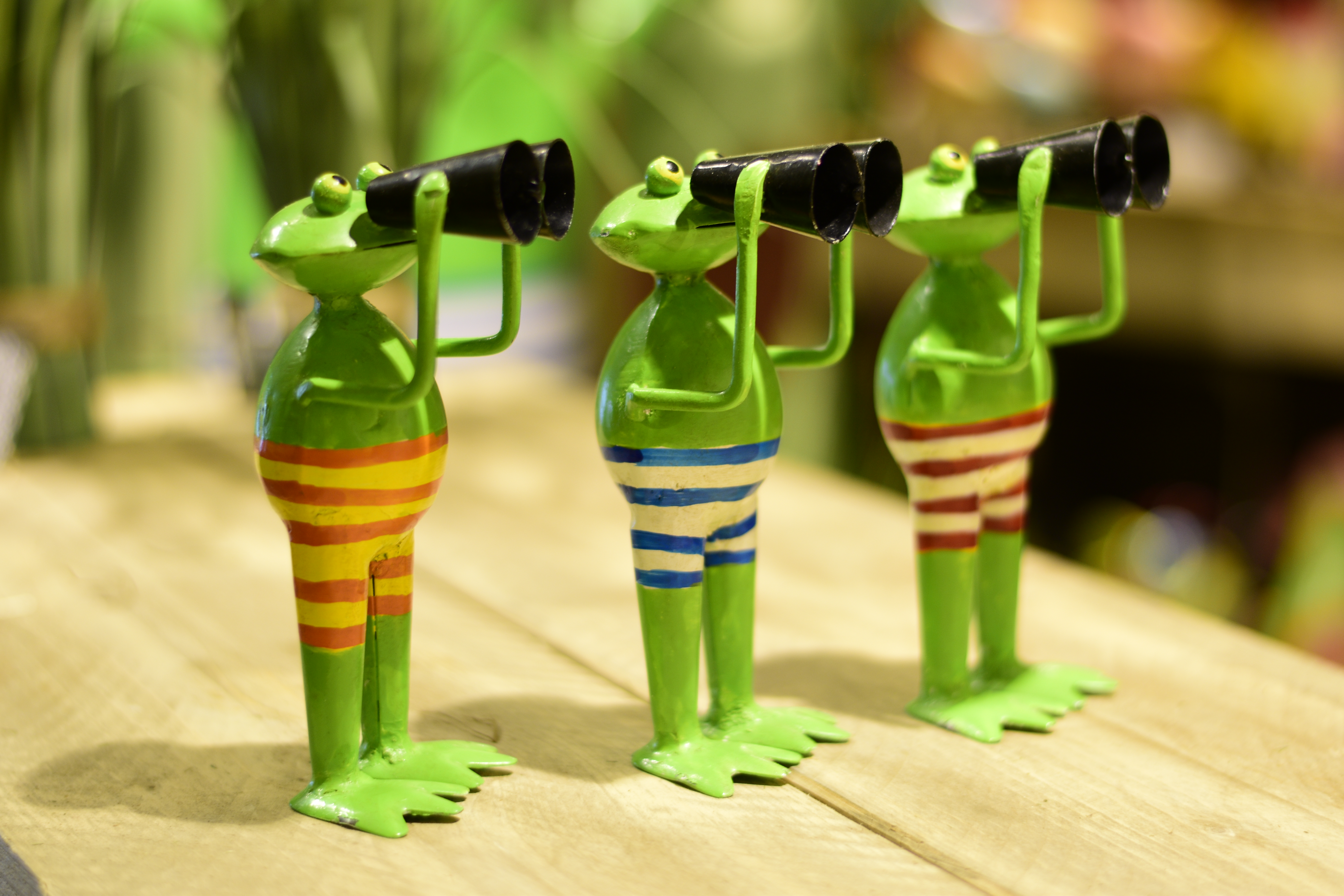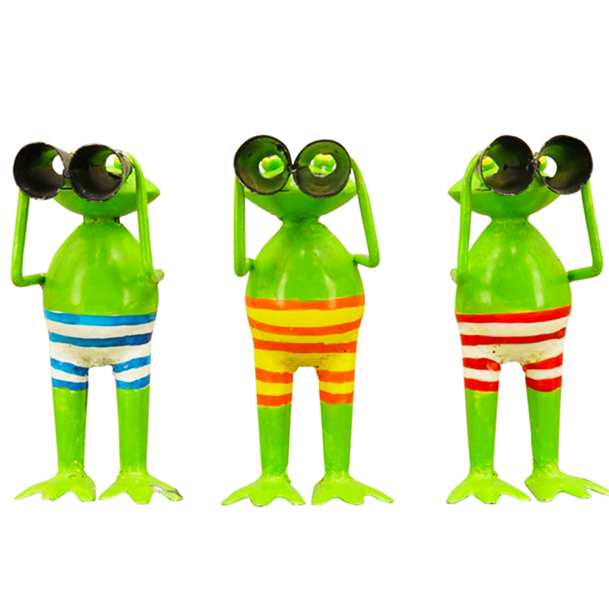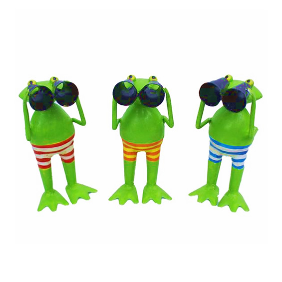 Deko Frosch Spanner, Metallfrosch mit Fernglas und rot-weißer Badehose, 15cm, Metall