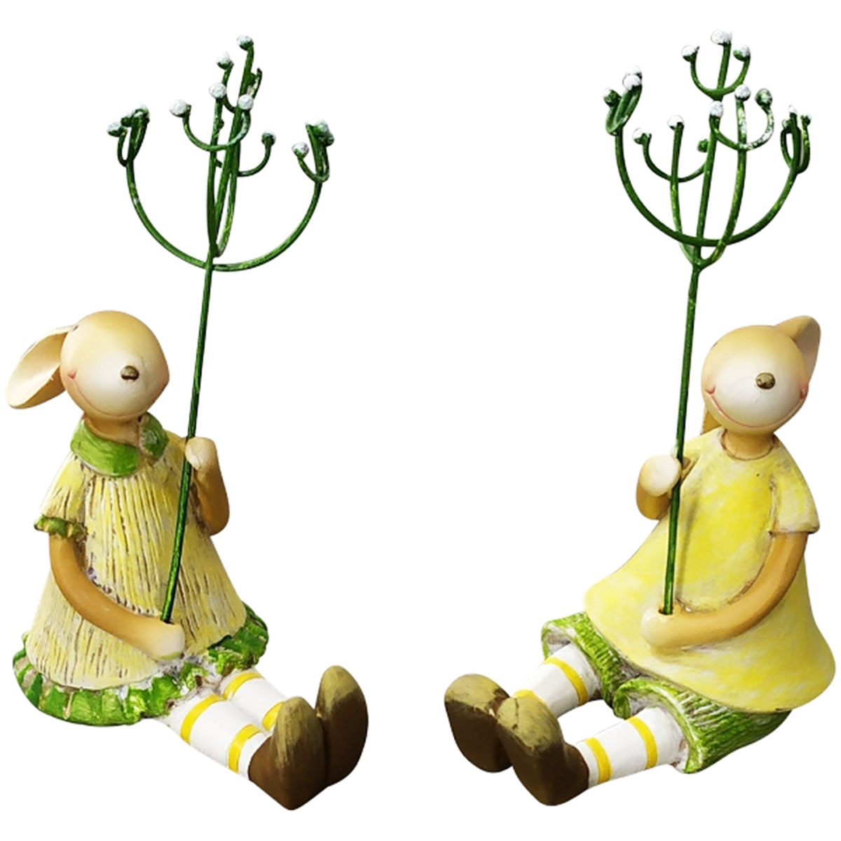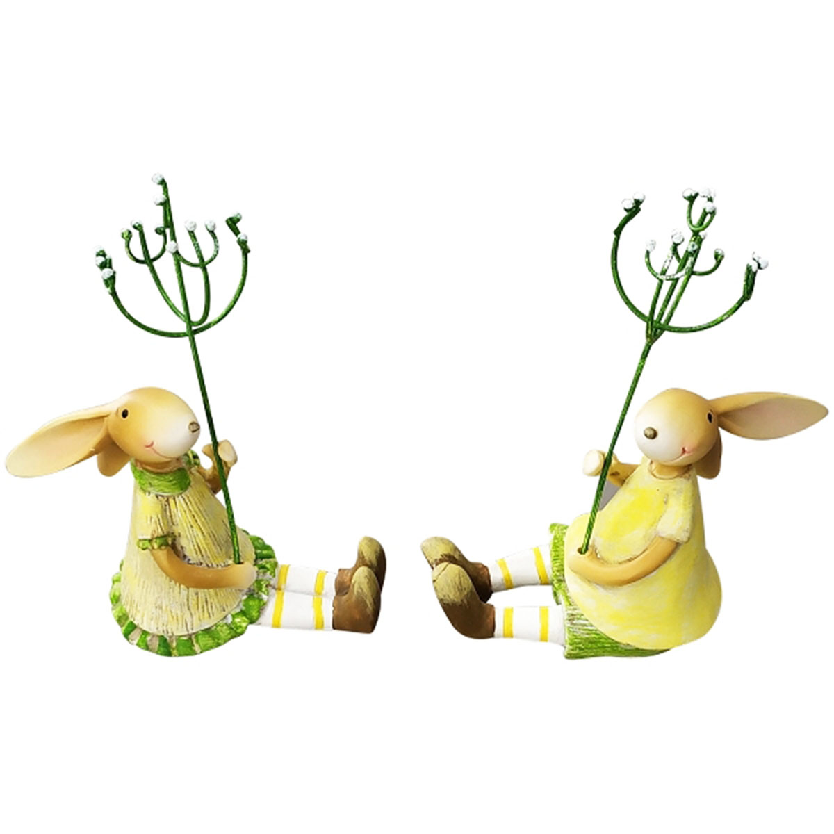 Produktinformationen "Deko Hase, Hase Sannie sitzend, Osterhase mit Hose und Blumenstengel, 13cm, Polyresin"
