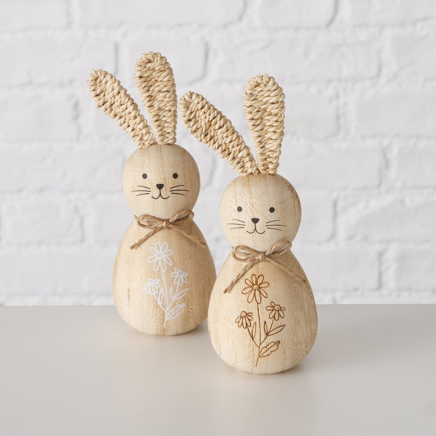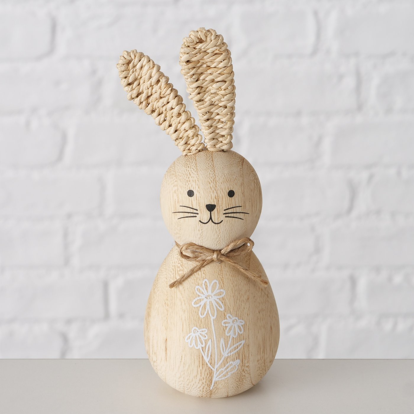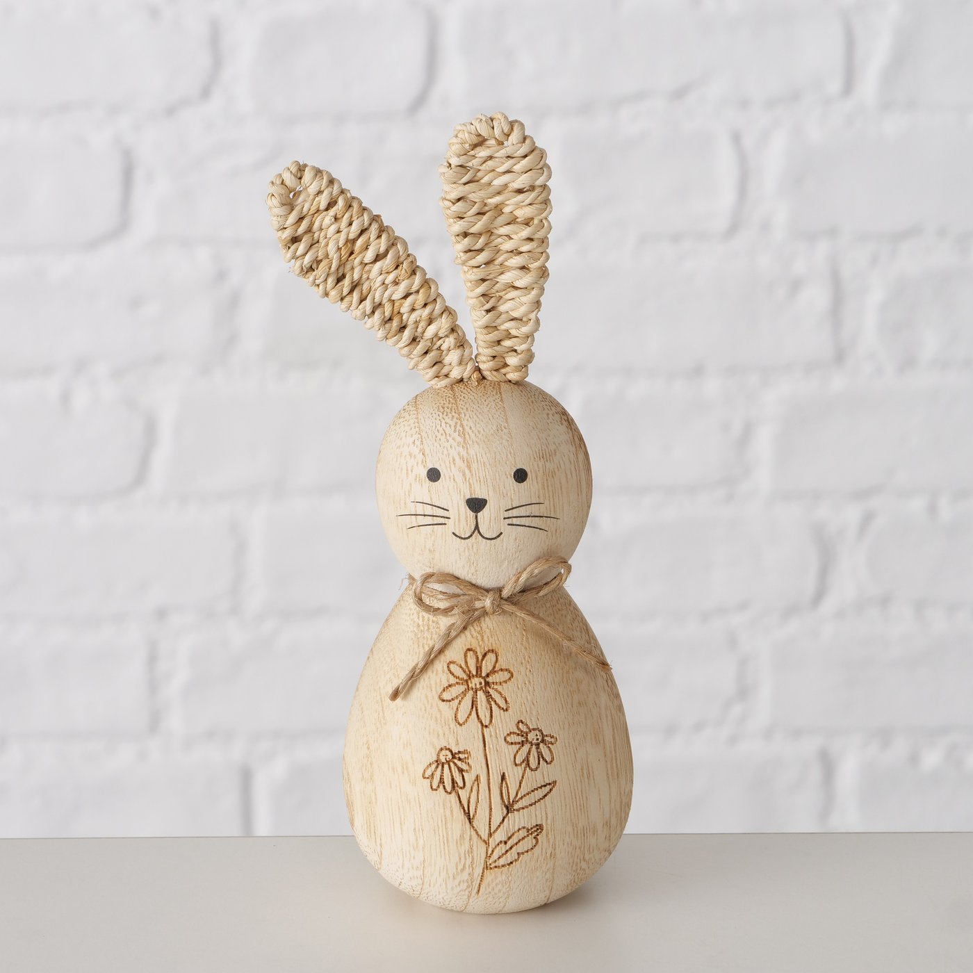 Deko Hase Sanela, Holzhase mit Bastohren und Blumen, 15cm, Naturholz, Boltze Home Collections