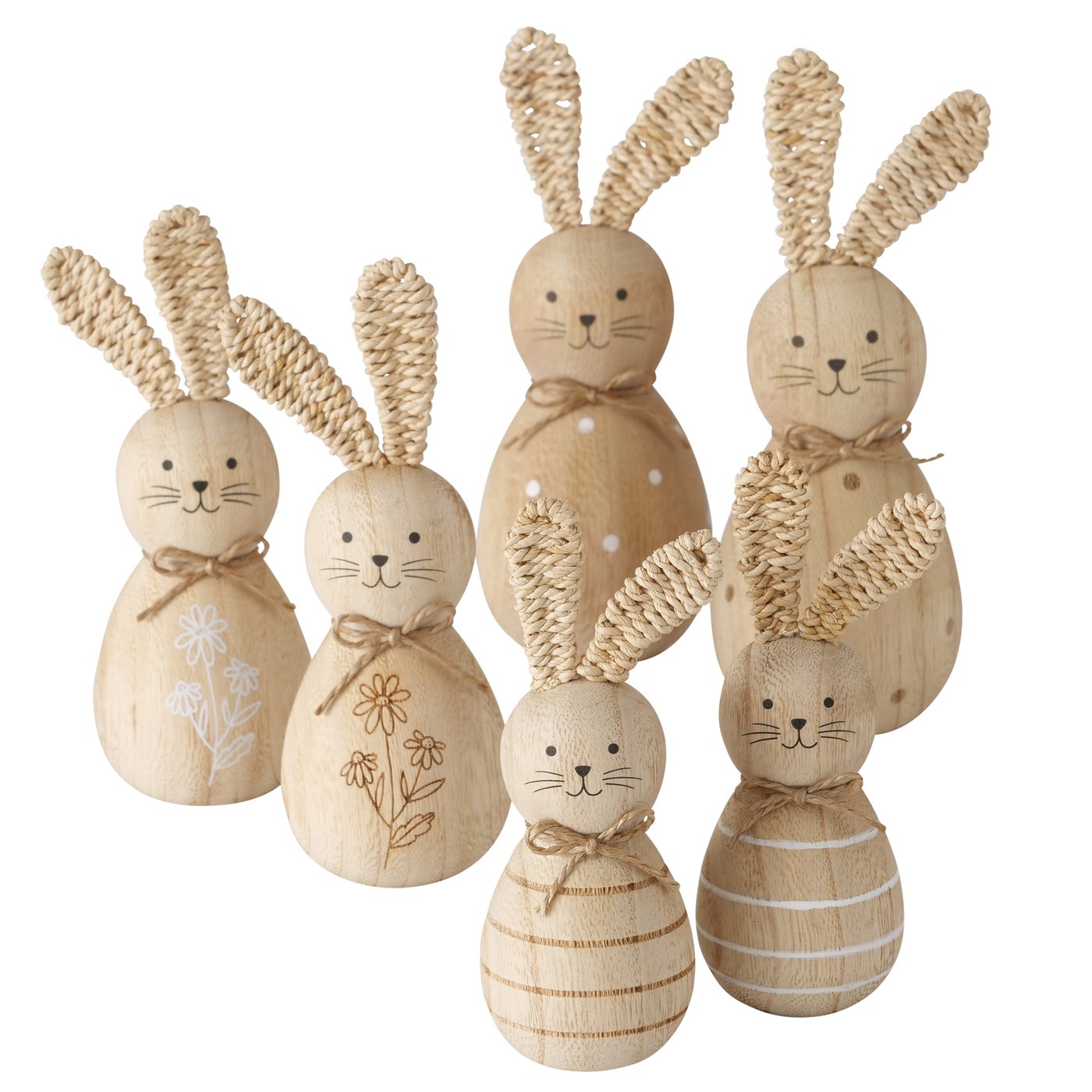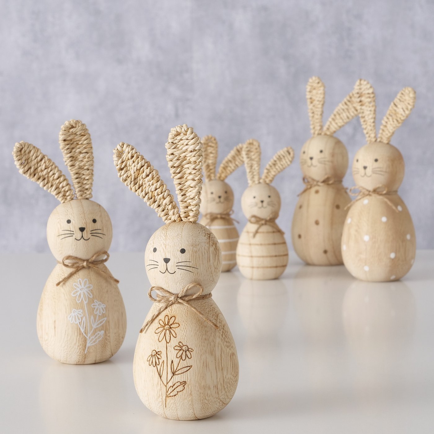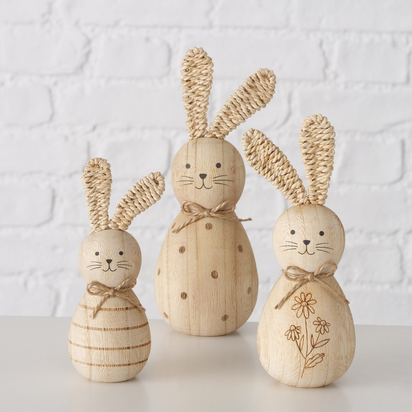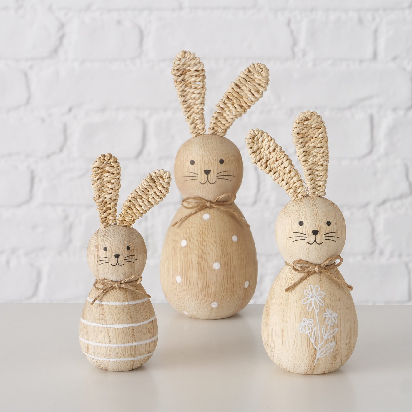 Deko Hase Sanela, Holzhase mit Bastohren und Blumen, 15cm, Naturholz, Boltze Home Collections