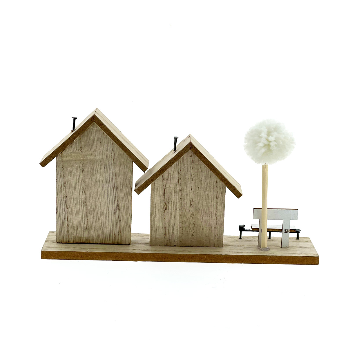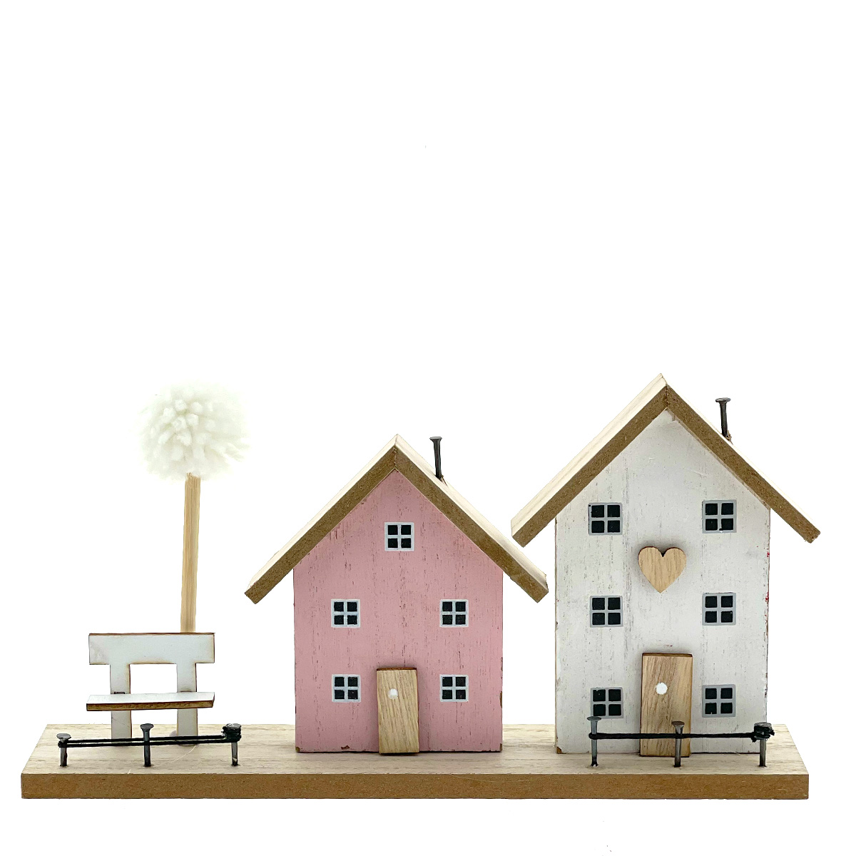 Deko Haus Häuserzeile, Holzhäuser mit Bank und Baum, rosa/weiß,24x13cm, Aufsteller