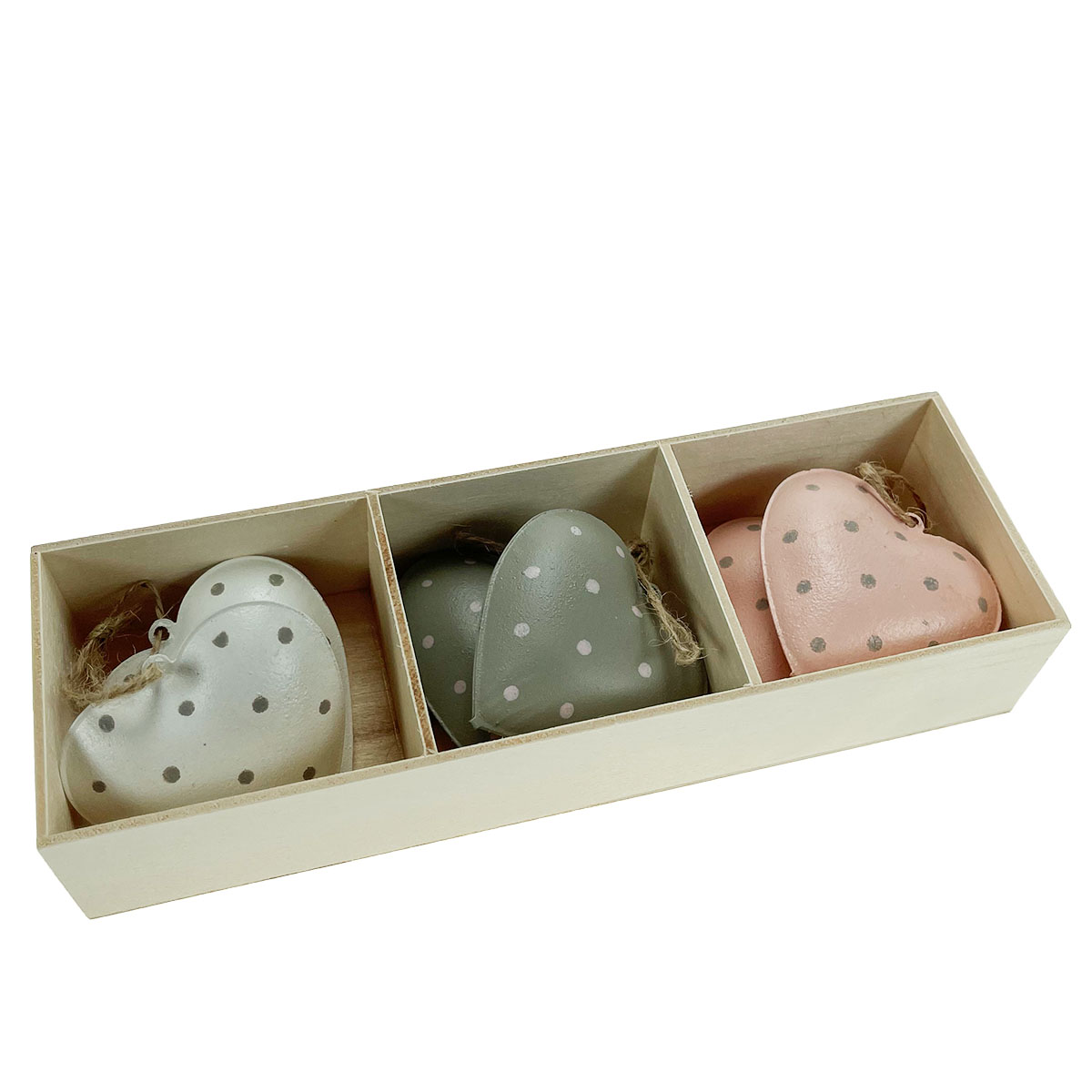 Produktinformationen "Deko Herz, Metallherze mit Punkte und Klang, rosa, grau, weiß, 3- fach sortiert, 6 St/Box, Hänger"