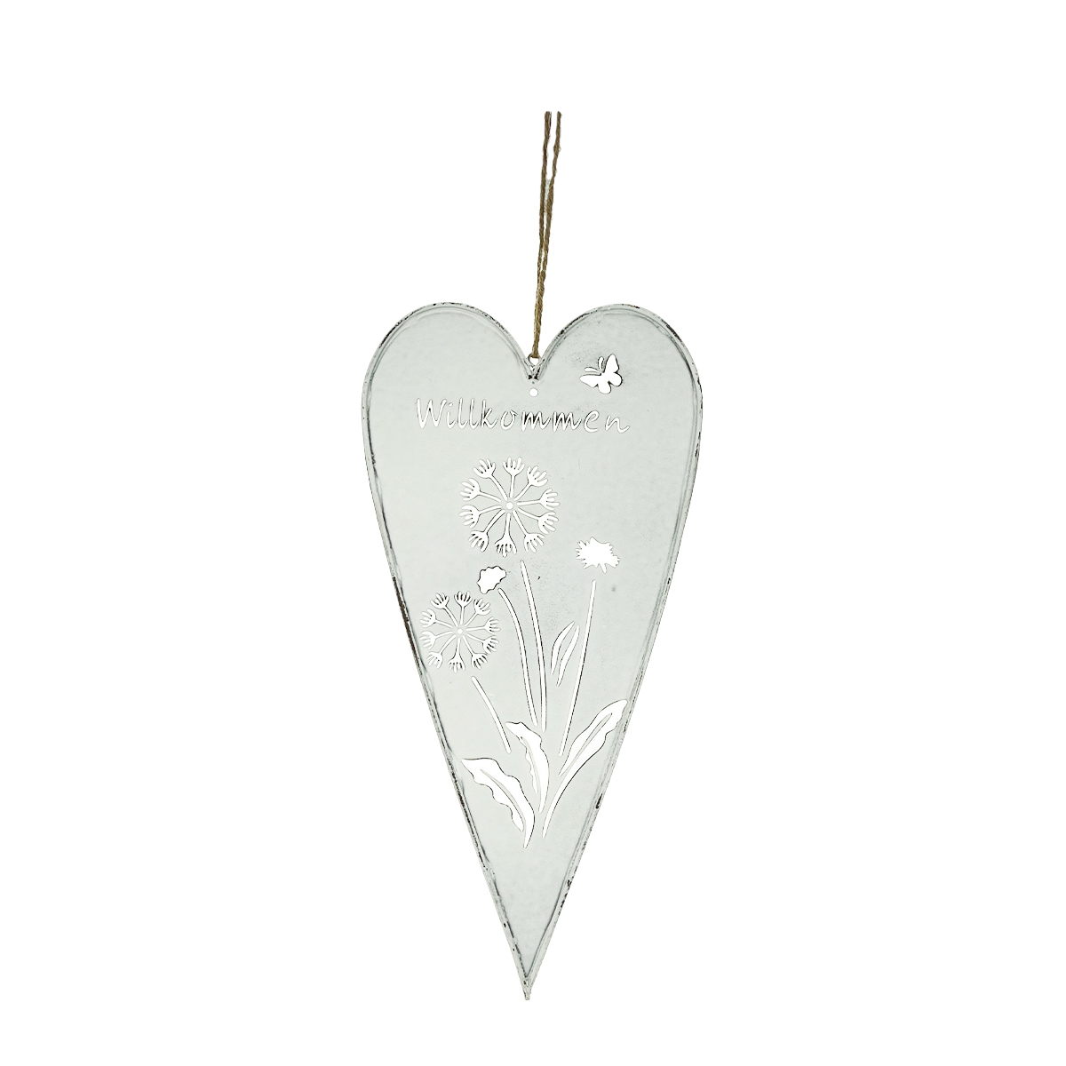 Deko Herz, Willkommen, Blumenmotiv, weiss-used look, 14x12cm, Metall, Hänger