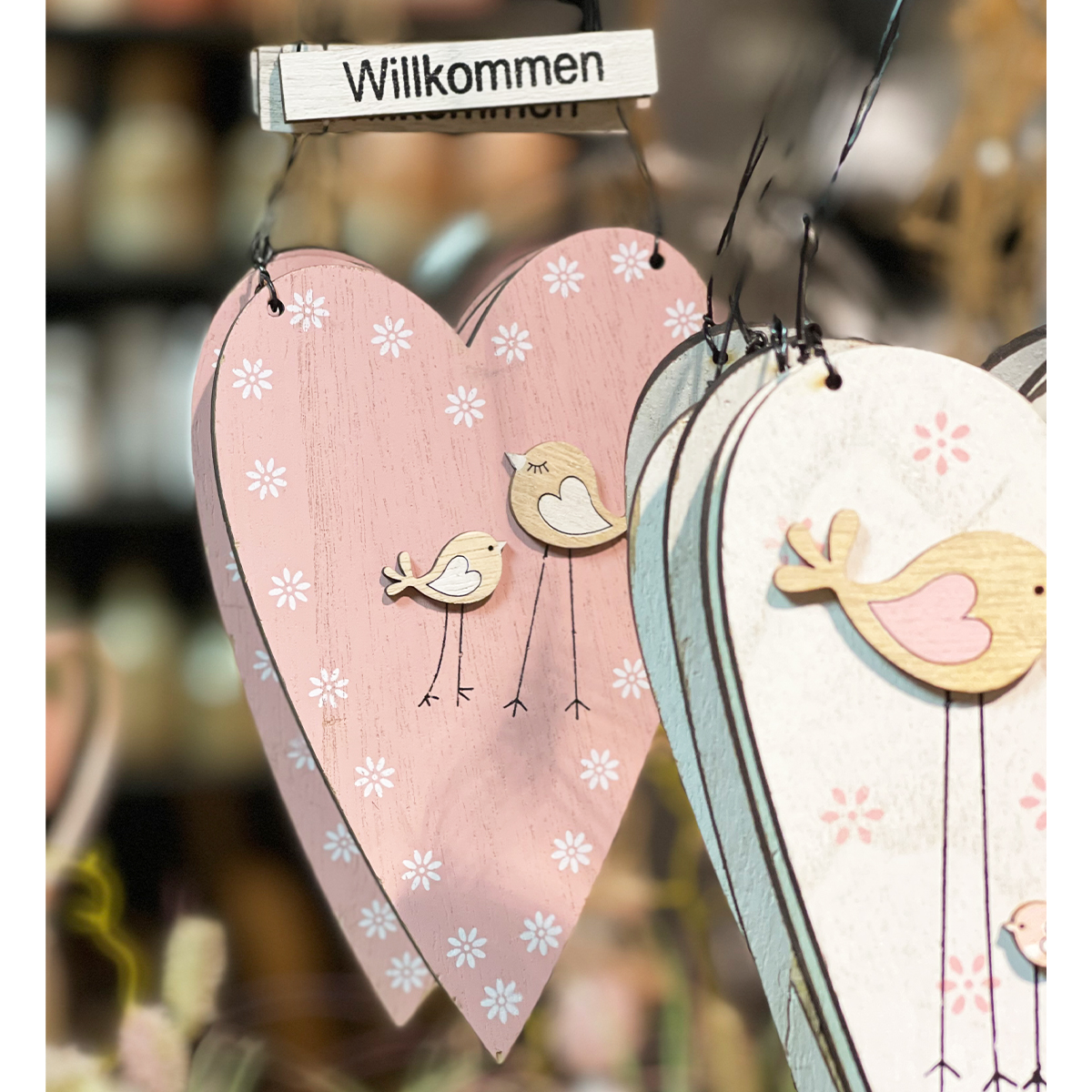 Holz Herz, mit Vögel, rosa und Willkommen, 27x11cm, Hänger