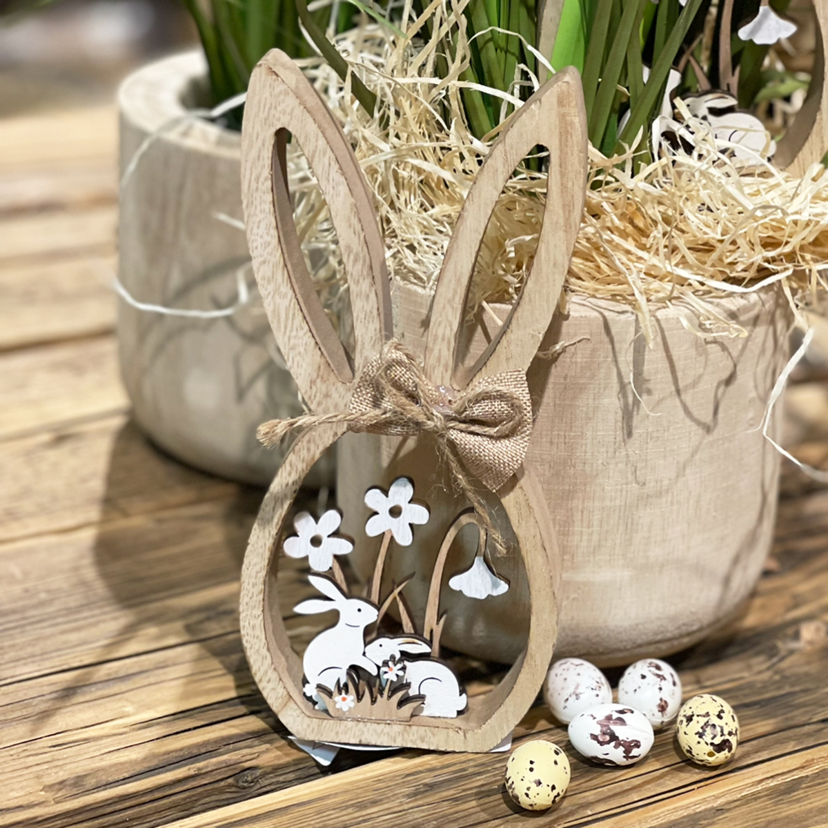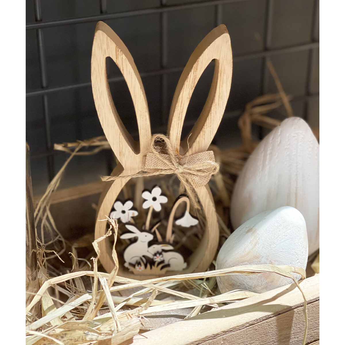 Deko Holzei, Hase mit Blumenwiese, natur, 9x20cm, Aufsteller