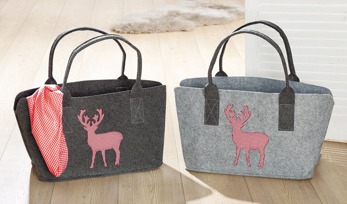 Filztasche Hirsch, Shopper Rotwild, rot/weiß karierter Hirsch, helles grau, 26x40cm, Gilde