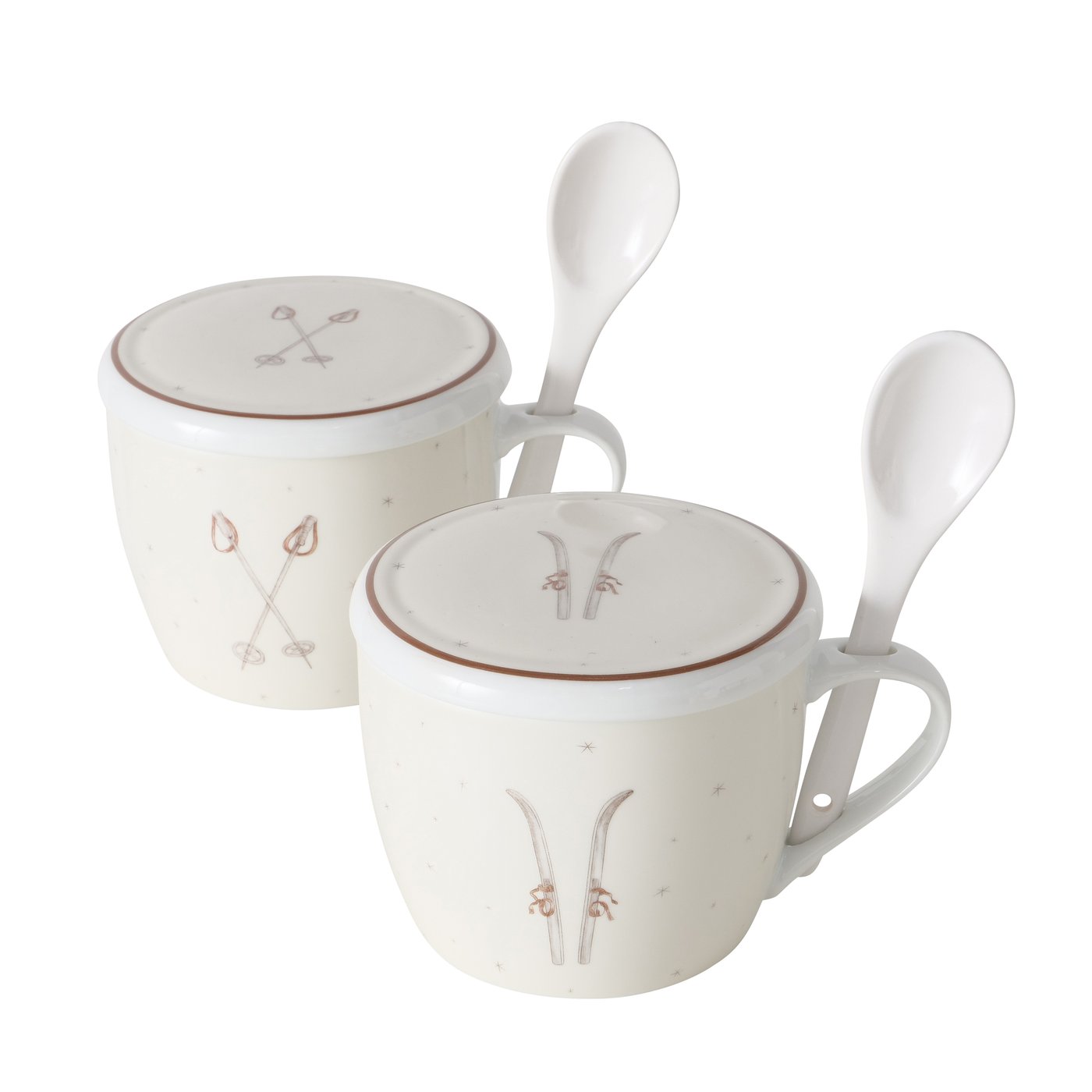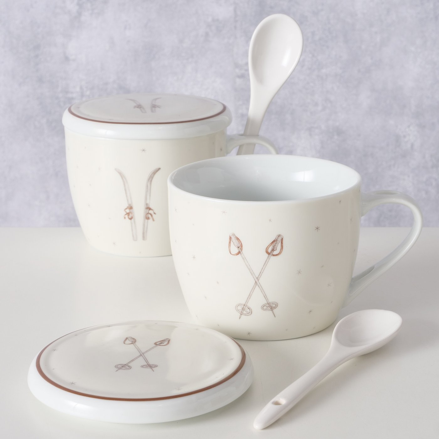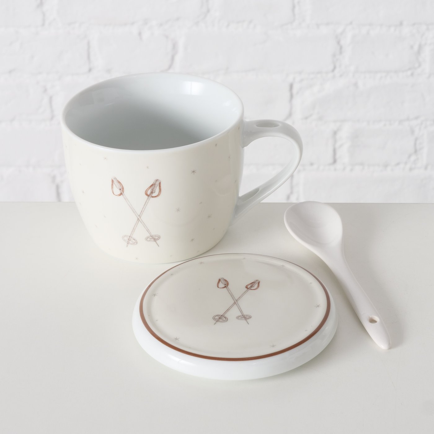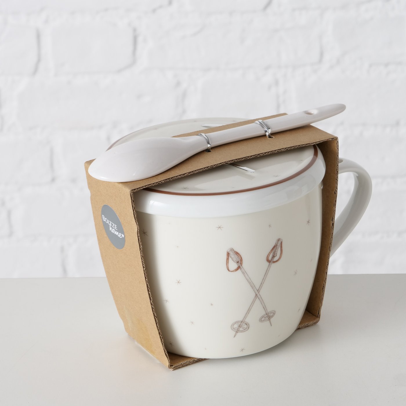 Jumbobecher Winter Skistöcke, Henkelbecher mit Löffel und Deckel, 600ml, Boltze Home Collections