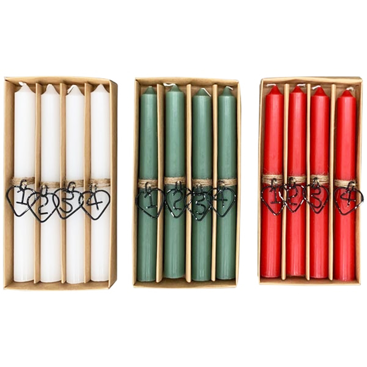 Stabkerzen grün, Weihnachtskerzen mit Herz und Zahlen 1-4, 4St/Box