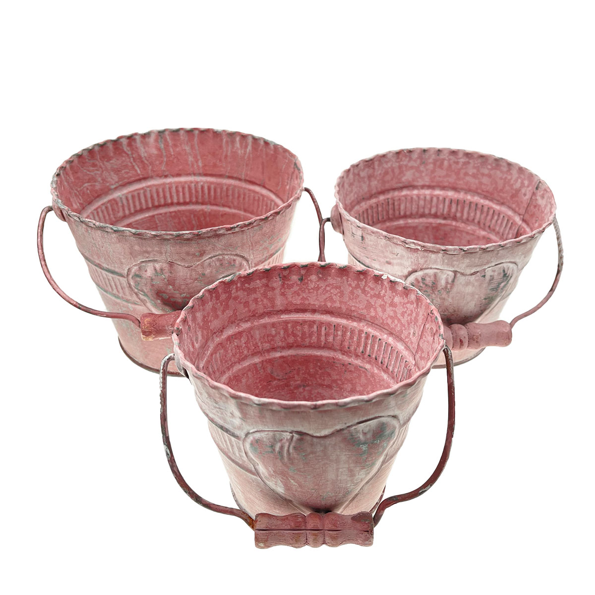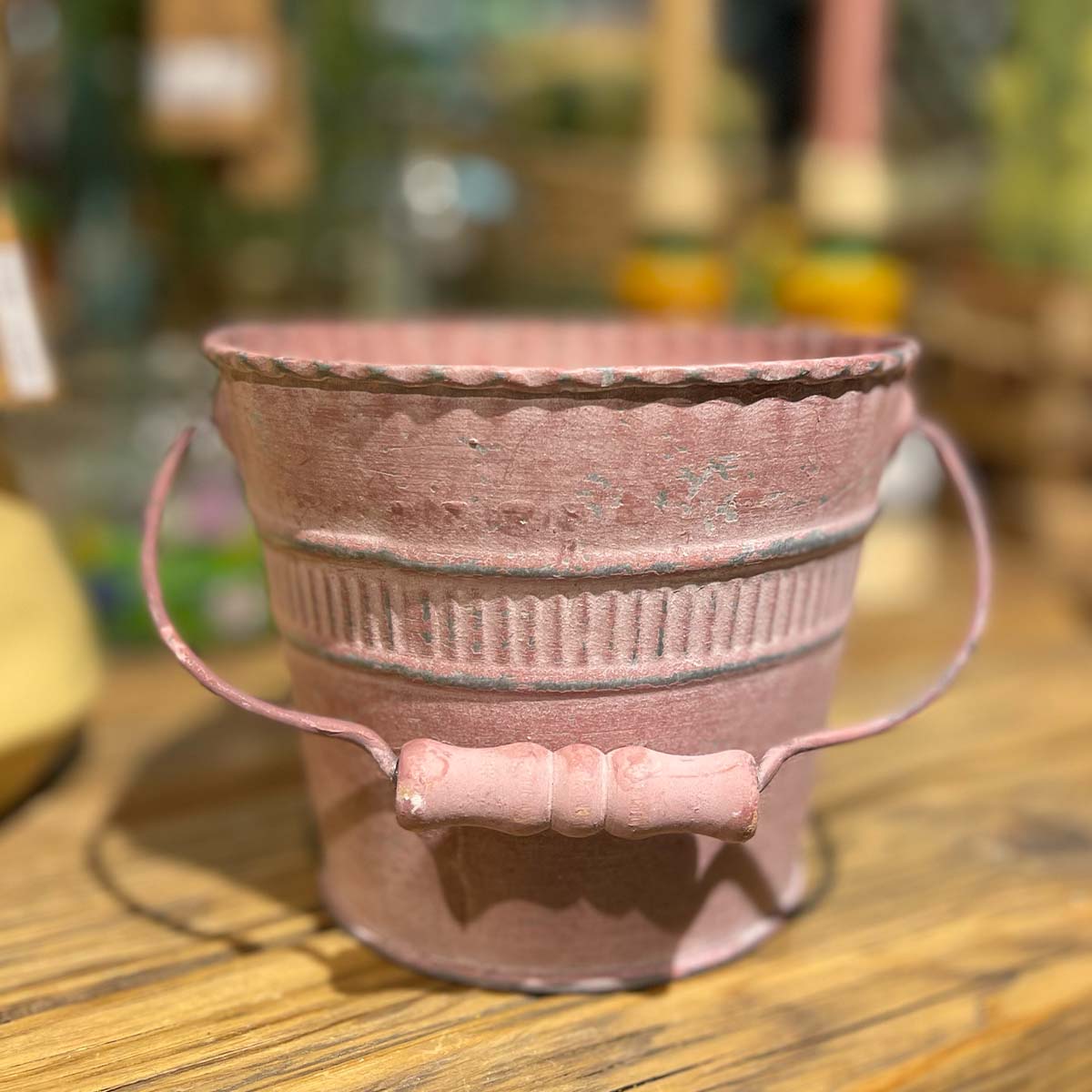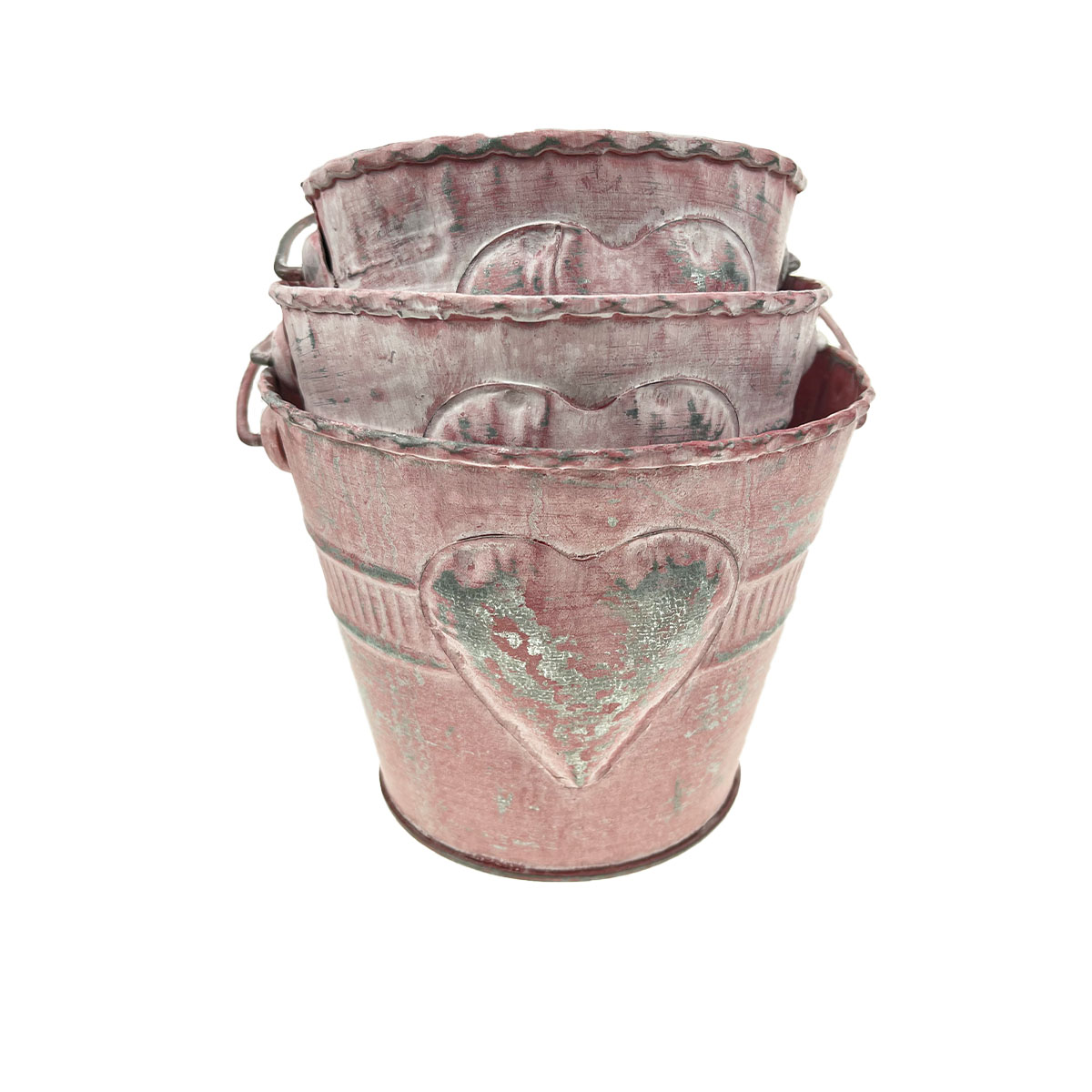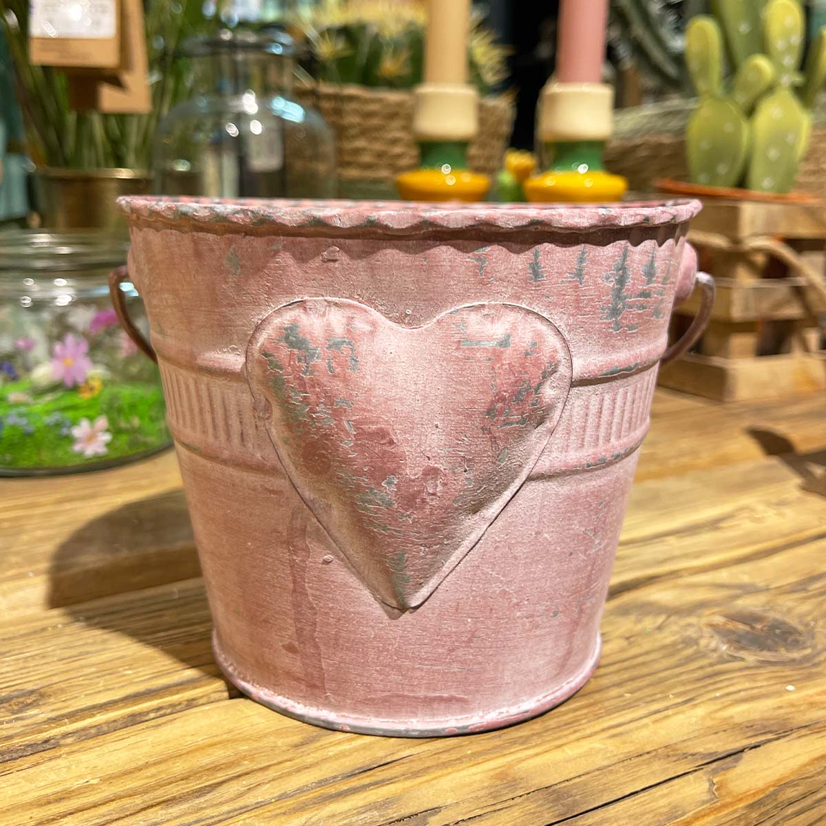 Übertopf Eimer mit Herz und Henkel, rosa used look, 12x10cm, Metall